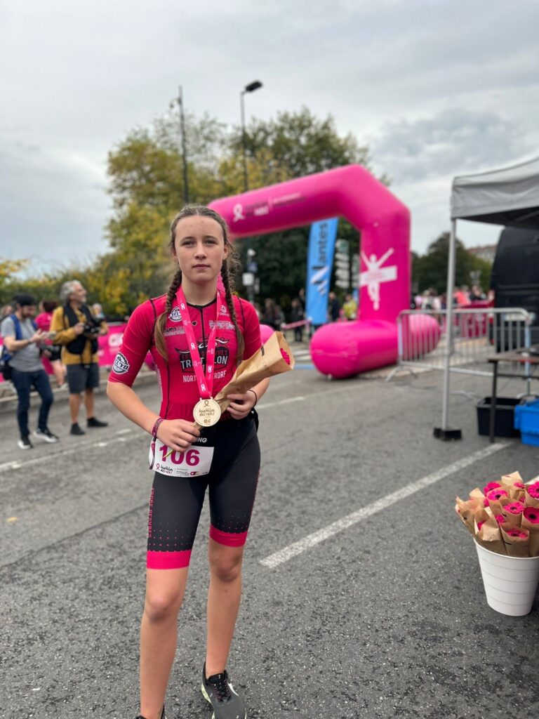 Ce dimanche 19 octobre, la jeune Melyna remplaçait Amélie au triathlon des Roses à Nantes avec la tenue de circonstance! Une natation en piscine, suivie d’un parcours vélo sur les quais et une course à pied urbaine. Cet évènement sportif et solidaire était co-organisé par la Fondation ARC pour la recherche sur le cancer et le Triathlon Club Nantais. Le Triathlon des Roses est un événement sportif de collecte dédié à la recherche sur les cancers du sein à l’occasion d’Octobre Rose. Amélie avait auparavant collecté des fonds pour soutenir des projets de recherche sur les cancers du sein, avant de passer le relais à Melyna pour la partie sportive. Côté classement, notre jeune pirate n’a pas démérité puisqu’elle termine première de sa catégorie et 60ème au scratch sur 299.